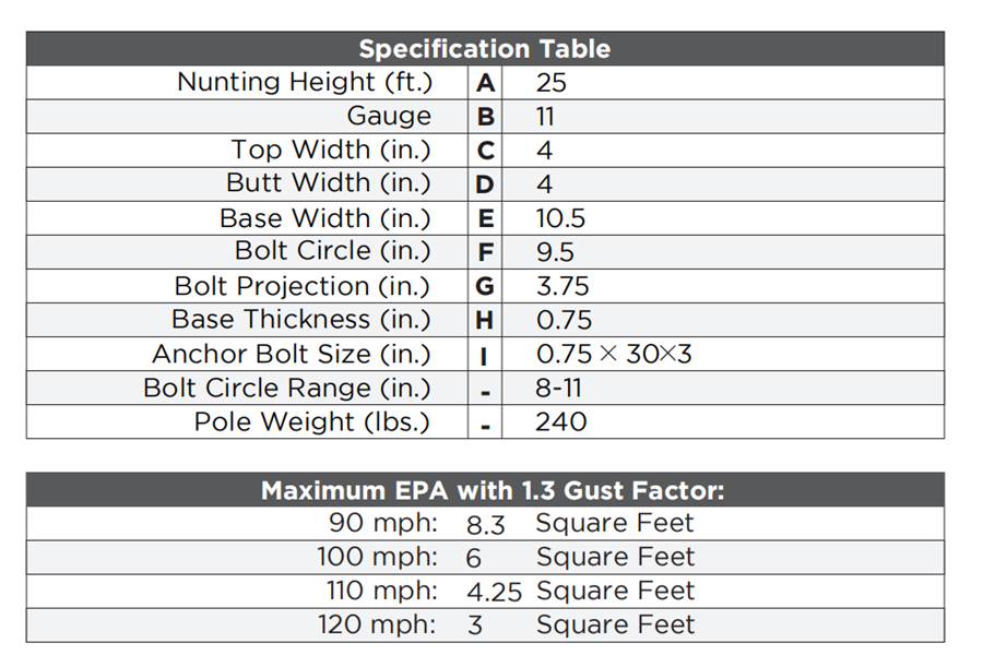●Pole Top Options: A removable plastic pole cap is provided if the pole is drilled for attaching light fixtures. The drill pattern and drill orientation needs to be provided by the customer unless Energy Light fixtures are used for the project. If a tenon option is selected, a steel tenon will be provided. A 23/8 inch diameter tenon with a 4 inch length is standard; however, the customer needs to confirm the appropriate tenon size required for the project.