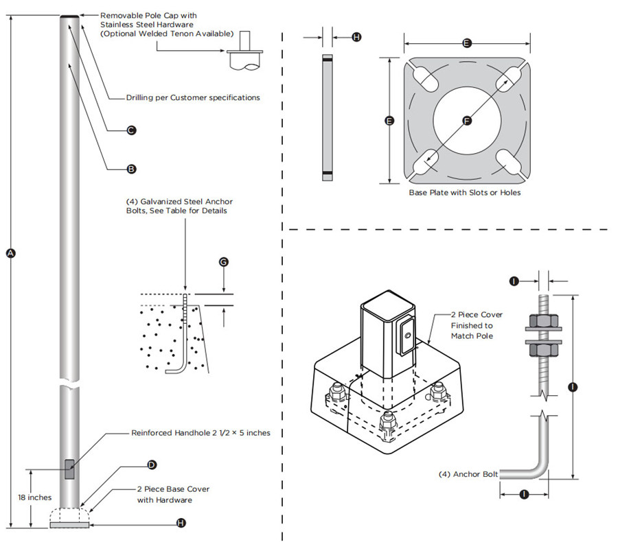 ●Other Options: The following options are available: Vibration dampener, custom tenon sizes, custom colors, electric/ GFI outlets, custom pole heights, additional handholes, UL compliant handholes and custom base plate dimensions. Please consult one of our light pole expert for details.