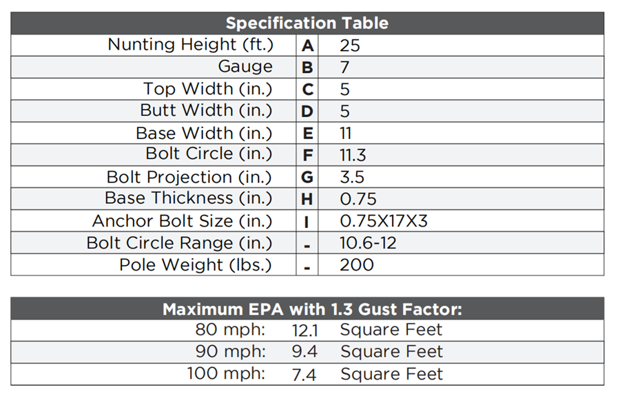 ●Anchor Bolts: A set of 4 steel anchor bolts (Grade 55) conforming to ASTM F1554 are provided with each pole assembly. Each bolt includes 2 nuts and 2 washers. The top part of the anchor bolt is threaded for securing and leveling the pole with the provided nuts and washers. An actual size paper anchor bolt template is provided.