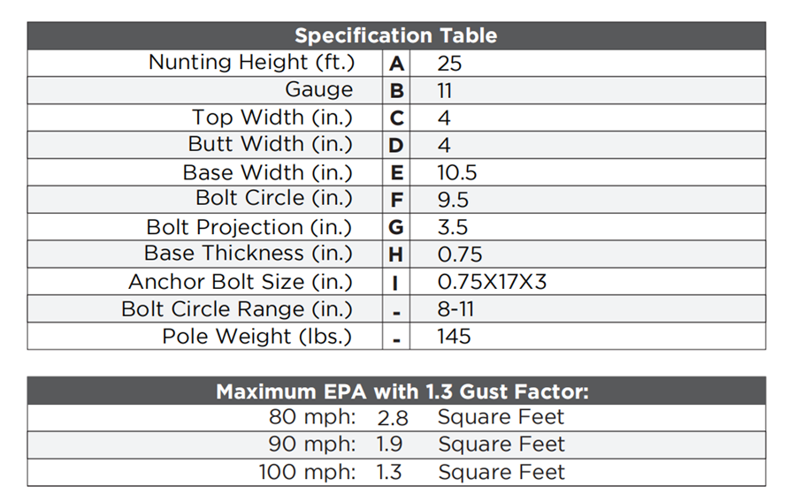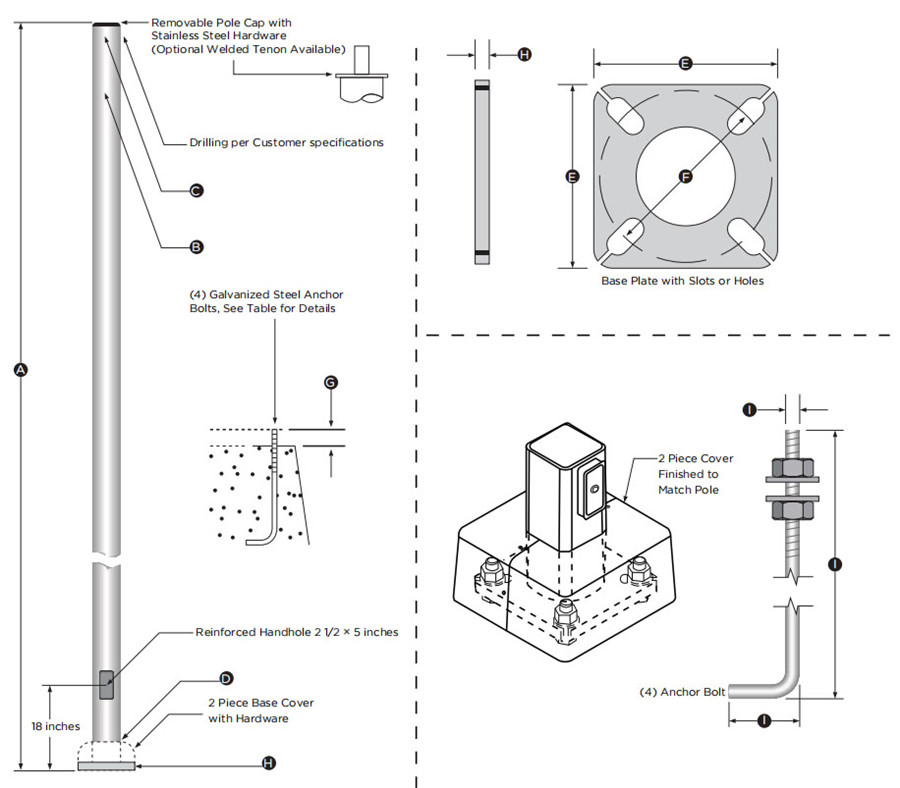 ●Anchor Bolts: A set of 4 steel anchor bolts (Grade 55) conforming to ASTM F1554 are provided with each pole assembly. Each bolt includes 2 nuts and 2 washers. The top part of the anchor bolt is threaded for securing and leveling the pole with the provided nuts and washers. An actual size paper anchor bolt template is provided.