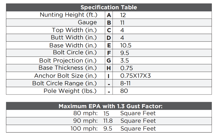●Anchor Bolts: A set of 4 steel anchor bolts (Grade 55) conforming to ASTM F1554 are provided with each pole assembly. Each bolt includes 2 nuts and 2 washers. The top part of the anchor bolt is threaded for securing and leveling the pole with the provided nuts and washers. An actual size paper anchor bolt template is provided.