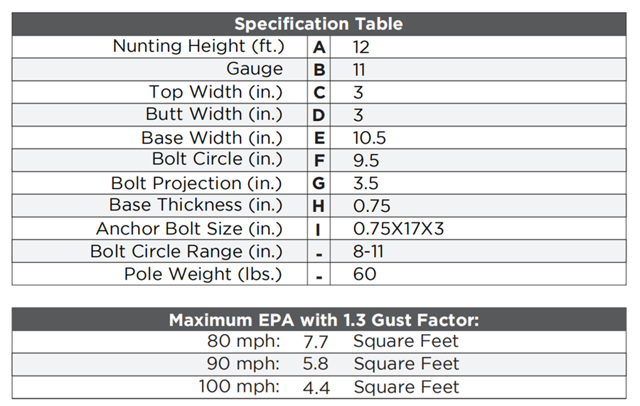 ●Anchor Bolts: A set of 4 steel anchor bolts (Grade 55) conforming to ASTM F1554 are provided with each pole assembly. Each bolt includes 2 nuts and 2 washers. The top part of the anchor bolt is threaded for securing and leveling the pole with the provided nuts and washers. An actual size paper anchor bolt template is provided.