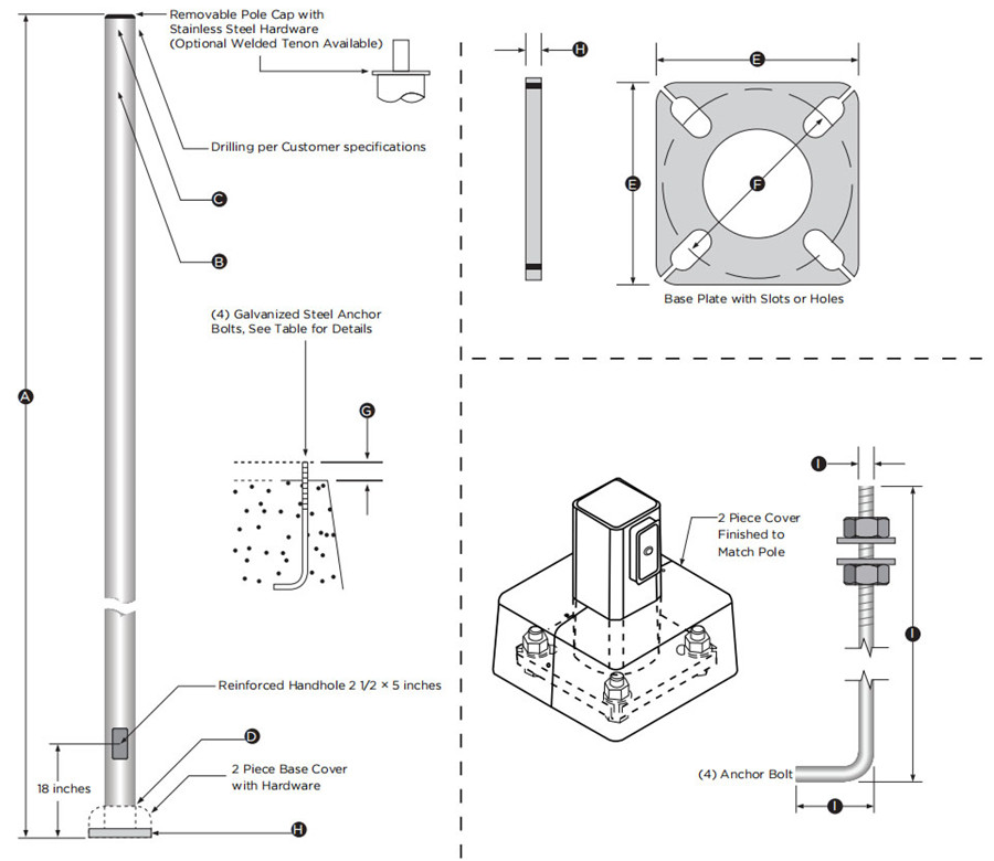 ●Anchor Bolts: A set of 4 steel anchor bolts (Grade 55) conforming to ASTM F1554 are provided with each pole assembly. Each bolt includes 2 nuts and 2 washers. The top part of the anchor bolt is threaded for securing and leveling the pole with the provided nuts and washers. An actual size paper anchor bolt template is provided.