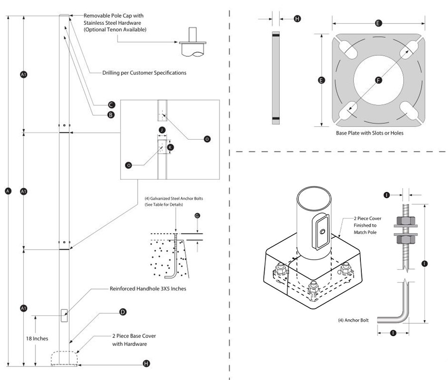 A removable aluminum pole cap is provided if the pole is drilled for attaching light fxtures. The drill pattern and drill orientation needs to be provided by the customer unless Energy Light fxtures are used for the project. If a tenon option is selected, a steel tenon will be provided. A 23/8 inch diameter tenon with a 4 inch length is standard; however, the customer needs to confirm the appropriate tenon size required for the project.