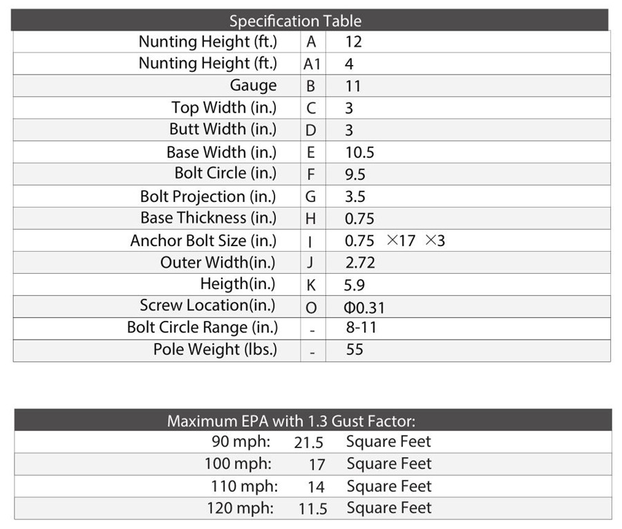 Commercial quality welded steel tubing of 3 piece A1 length construction with a minimum yield strength of 55,000 psi is used to fabricate the pole shaft and hold the connection position with screws. ●Handhole: 3 X 5 inches tall reinforced handhole is provided at 18 inches from the base. A cover with a single screw to secure the latch mechanism is also provided.