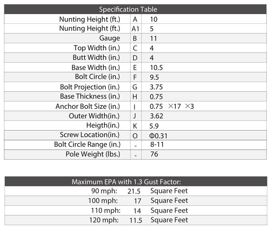 Commercial quality welded steel tubing of 2 piece A1 length construction with a minimum yield strength of 55,000 psi is used to fabricate the pole shaft and hold the connection position with screws.