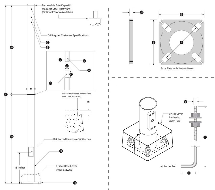 A removable aluminum pole cap is provided if the pole is drilled for attaching light fixtures. The drill pattern and drill orientation needs to be provided by the customer unless Energy Light fixtures are used for the project. If a tenon option is selected, a steel tenon will be provided. A 23/8 inch diameter tenon with a 4 inch length is standard; however, the customer needs to confirm the appropriate tenon size required for the project.