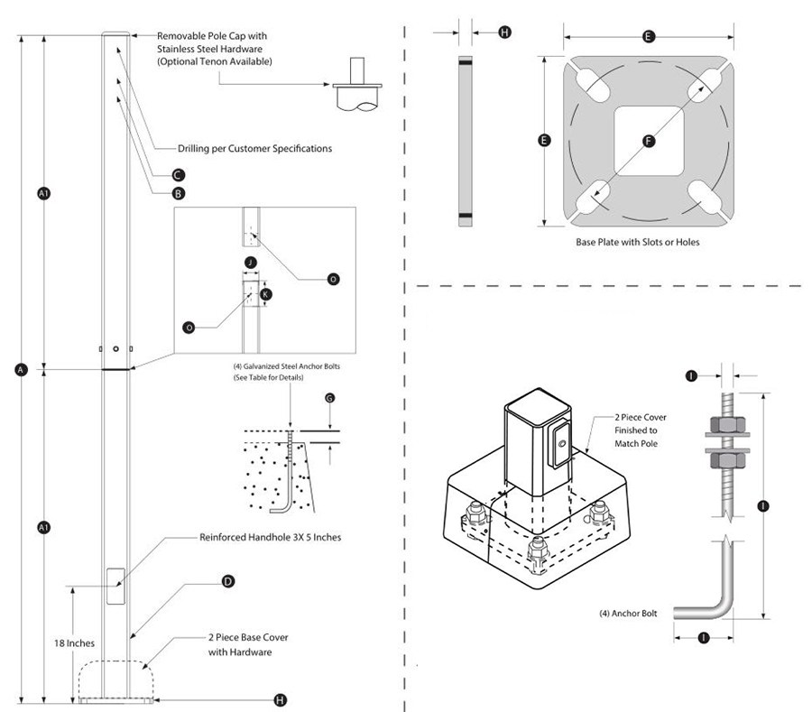 A removable aluminum pole cap is provided if the pole is drilled for attaching light fxtures. The drill pattern and drill orientation needs to be provided by the customer unless Energy Light fxtures are used for the project. If a tenon option is selected, a steel tenon will be provided. A 23/8 inch diameter tenon with a 4 inch length is standard; however, the customer needs to confirm the appropriate tenon size required for the project.