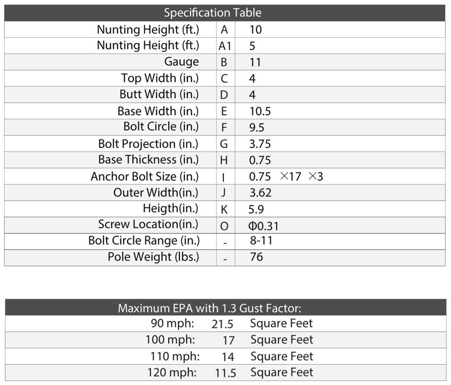 Commercial quality welded steel tubing of 2 piece A1 length construction with a minimum yield strength of 55,000 psi is used to fabricate the pole shaft and hold the connection position with screws.